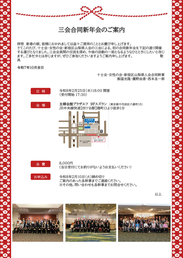 このたび、十士の会・女性の会・新宿区山梨県人会の3会による、初の合同新年会を下記の通り開催する運びとなりました。
